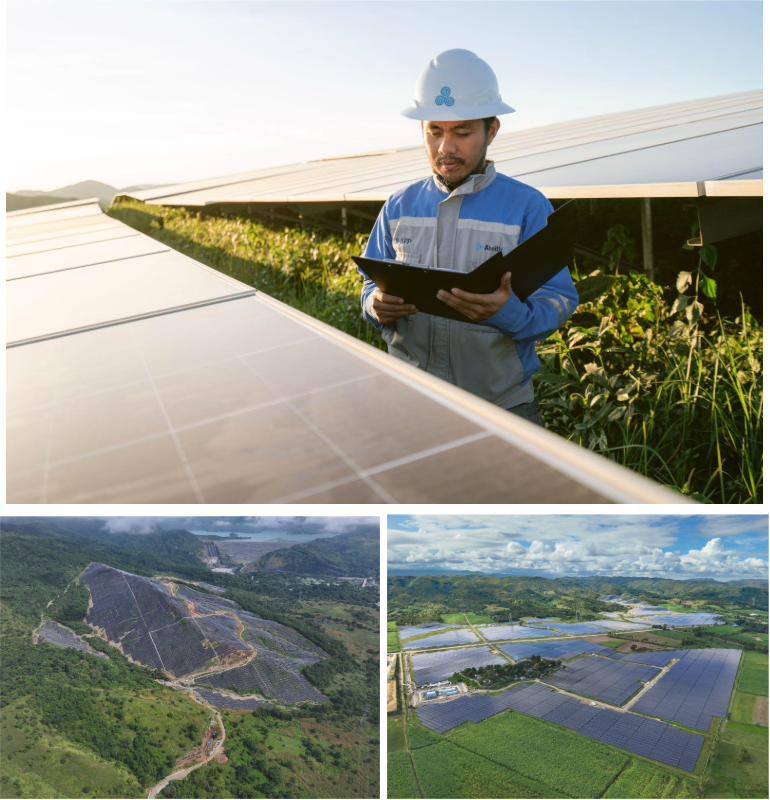 (Top) A plant engineer inspects the 94-megawatt peak (MWp) Cayanga-Bugallon solar power plant in Pangasinan. (Bottom left) The 93-MWp San Manuel solar power plant in Pangasinan, Aboitiz Renewables’ sixth solar power facility. (Bottom right) The 173-MWp Calatrava solar power plant in Negros Occidental stands as the largest solar PV installation in the Visayas — a milestone in the region’s clean energy transition.