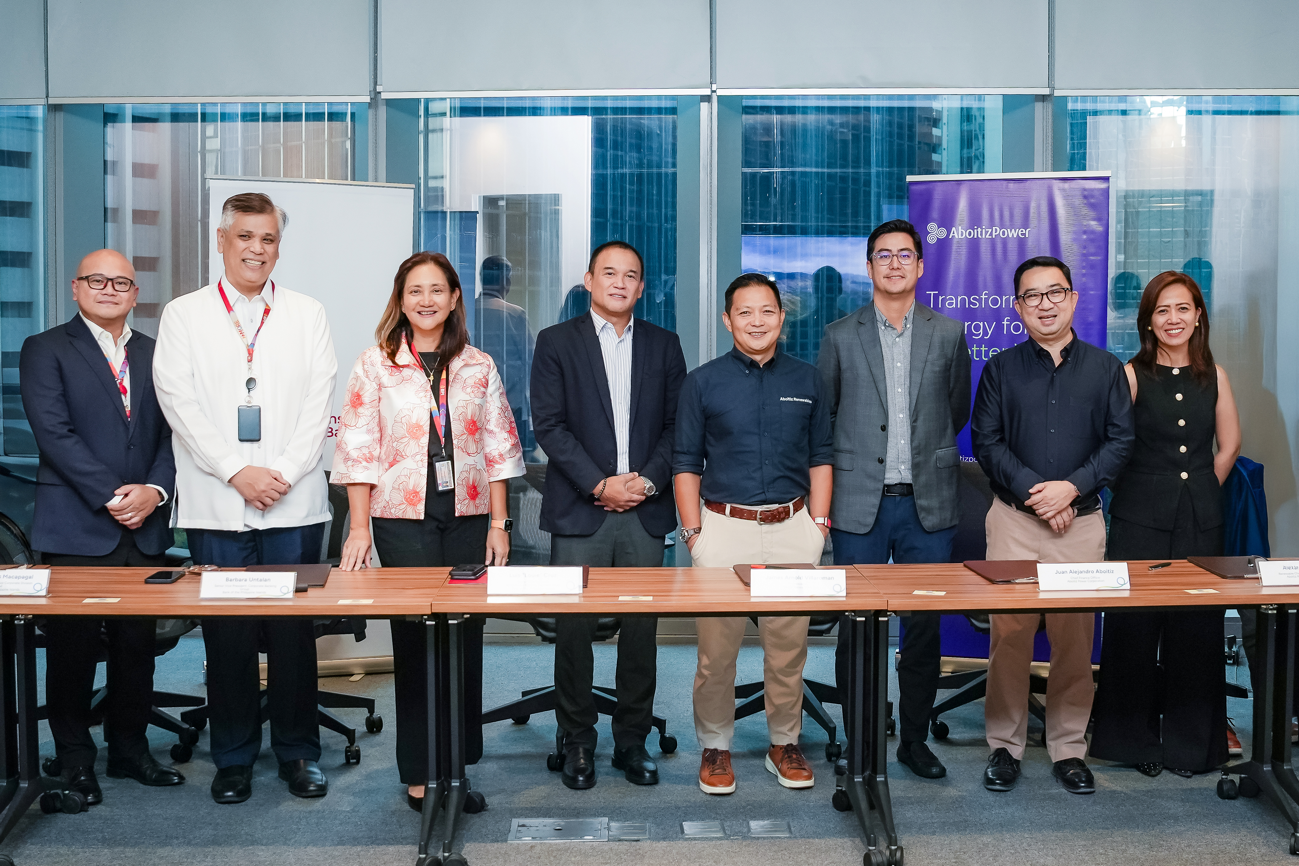 Ceremonial loan signing. (L-R) The Bank of the Philippine Islands — represented by Top Corporates Team Head Raymond Anthony M. Cirujano; Top Corporates Division Head Juan Jesus C. Macapagal; Corporate Banking Group Head Barbara C. Untalan; and Institutional Banking Segment Head Luis E. Cruz — together with Aboitiz Renewables President Jimmy Villaroman; AboitizPower CFO Juan Alejandro Aboitiz; Aboitiz Renewables COO Alexander Coo; and Aboitiz Renewables CFO Marsha Santos.